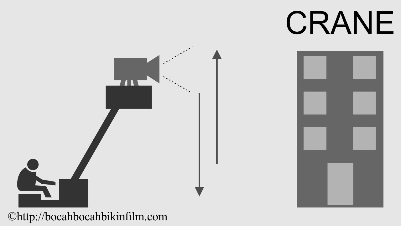 Pergerakan kamera ke atas – ke bawah dengan operator kamera, tidak berpaku pada poros. Adapula yang menyebut ini gerakan dolly-up, dolly-down. Gerakan ini disebut crane, nama dari alat yang digunakan. Biasanya pergerakan ini digunakan untuk mengambil gambar gedung yang tinggi, dalam film-film aksi, untuk menambah ketegangan, karena dapat memperlihatkan ketinggian.